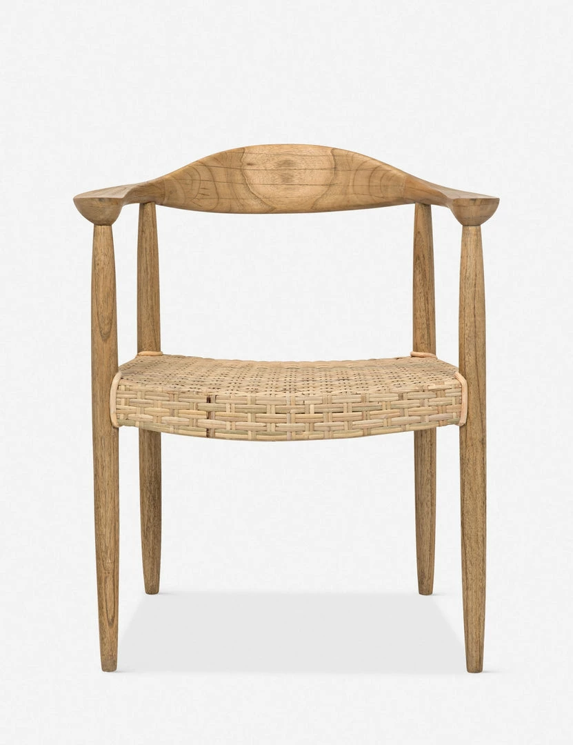 A classic dining chair with an easy, coastal look, the Trisha features tapered wooden legs, and soft curves along the arms and backrest. A woven rattan seat adds contrasting texture with casual appeal.