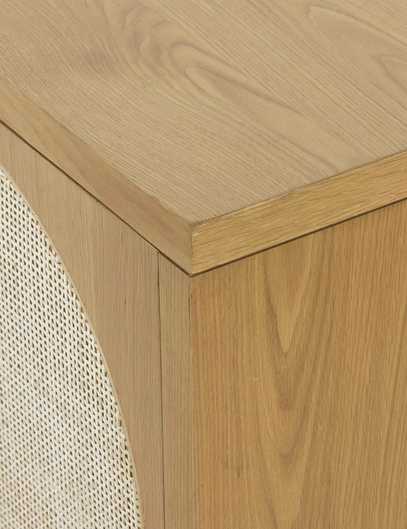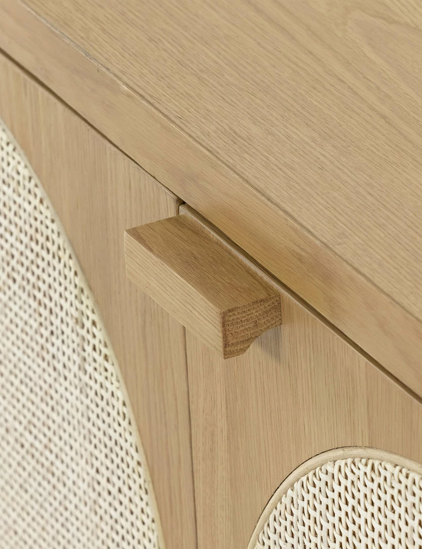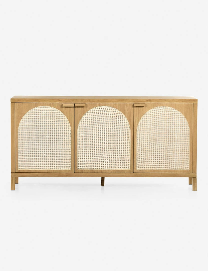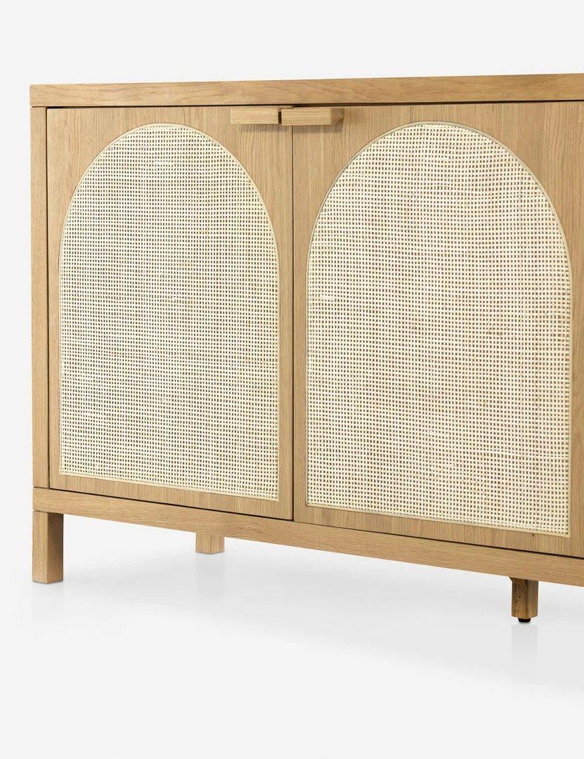 Honey-finished oak and arched cane paneling inspire transitional appeal in the Verna Sideboard. With spacious shelving and rear cutouts for cord management, this versatile piece can add effortless warmth to your look, whether styled as a media console or sideboard buffet.