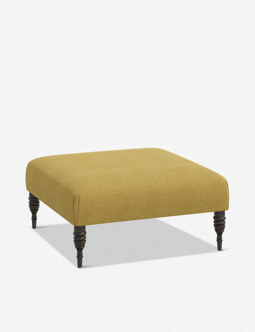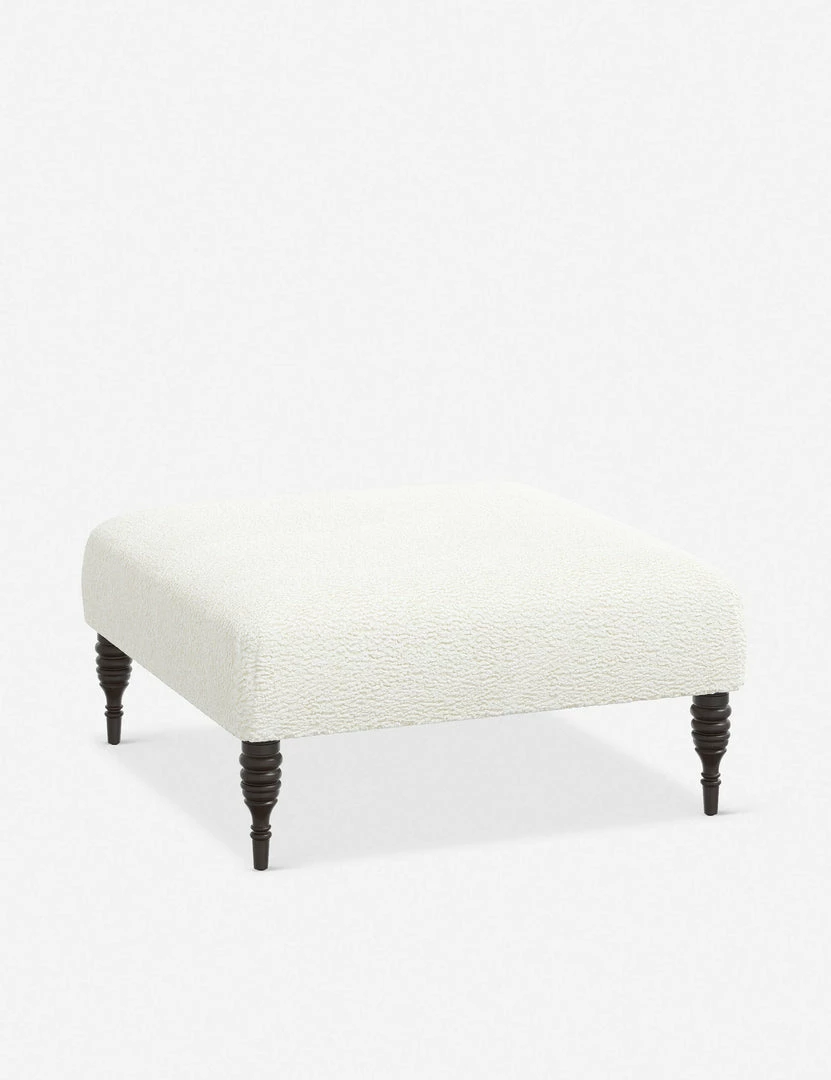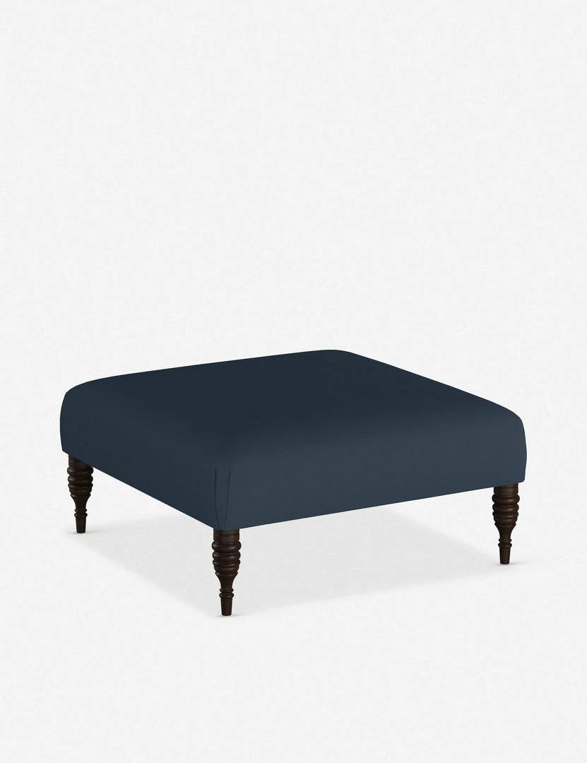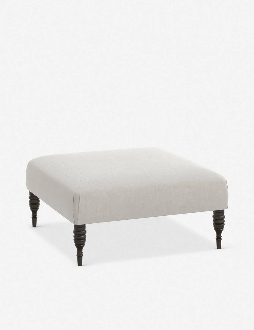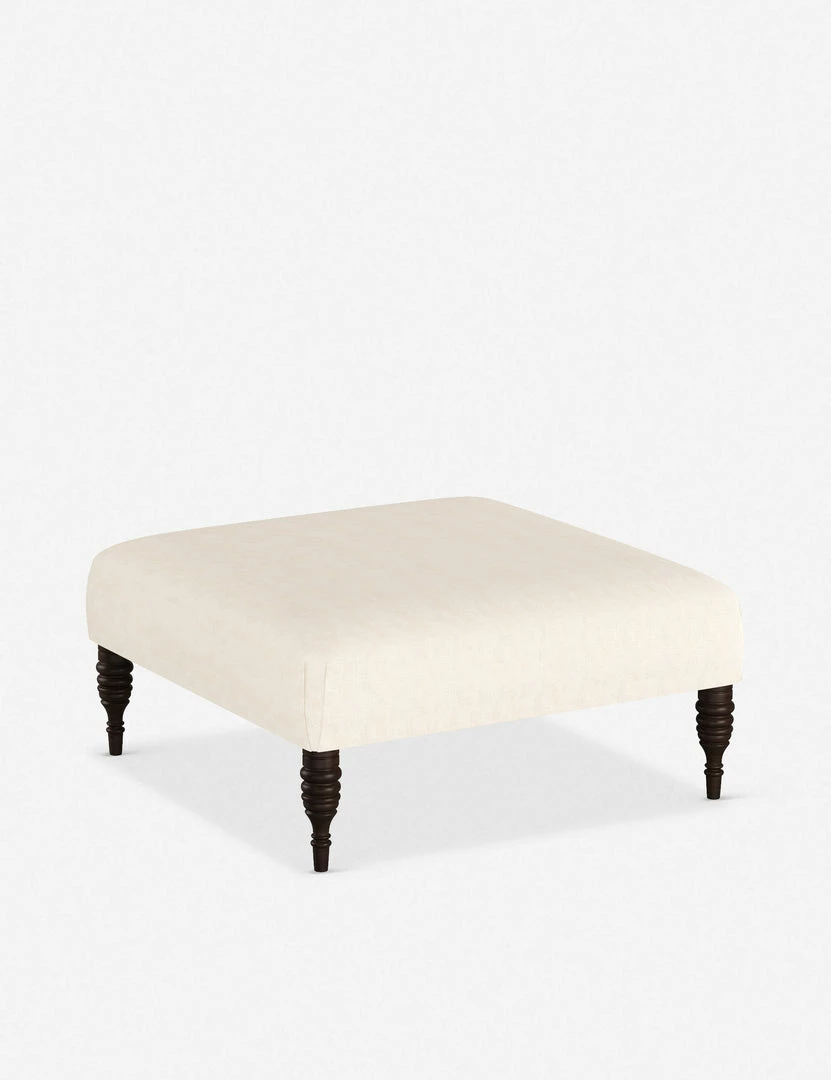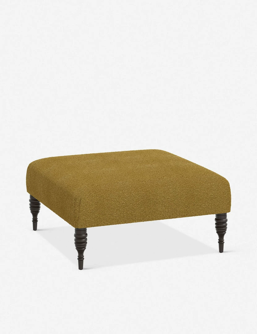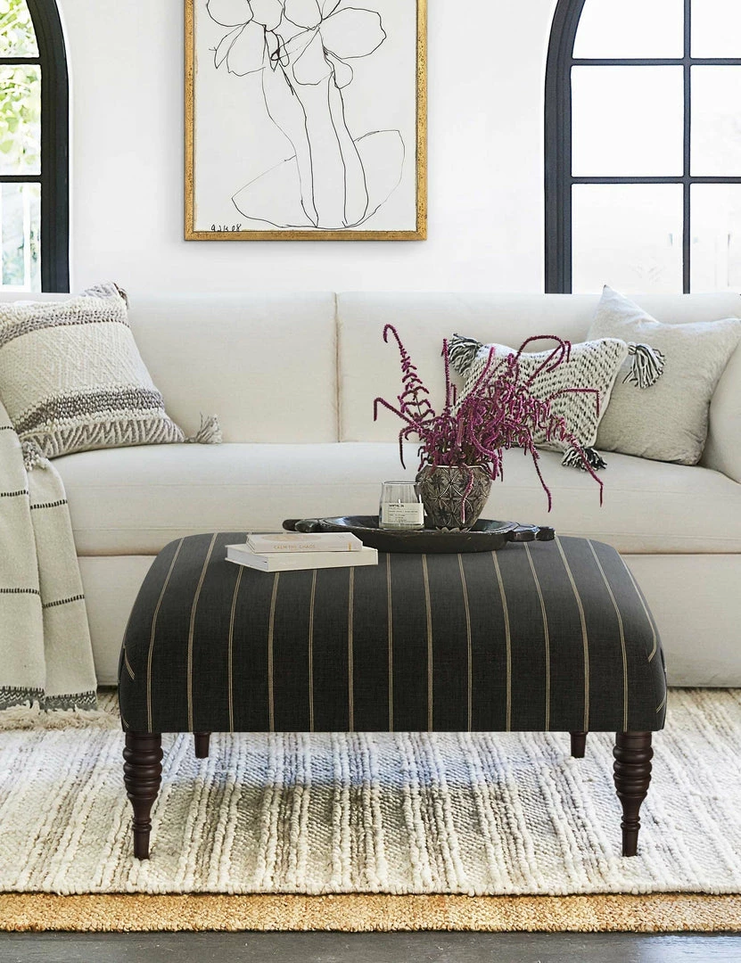 With ornate turned legs and an upholstered top, this ottoman blends traditional details with a fresh design. Its proportions make it an ideal dynamic accent for a living room where it can be used for extra seating or as a coffee table