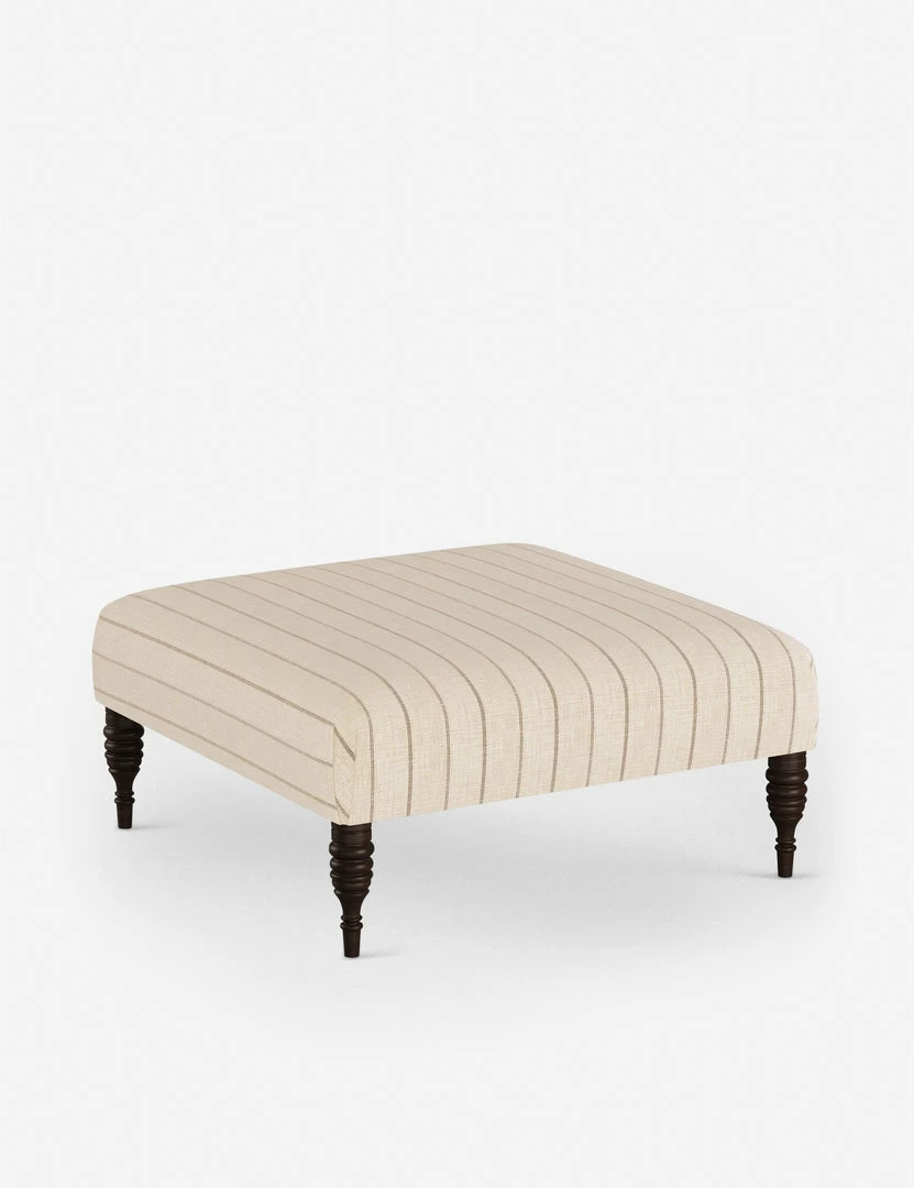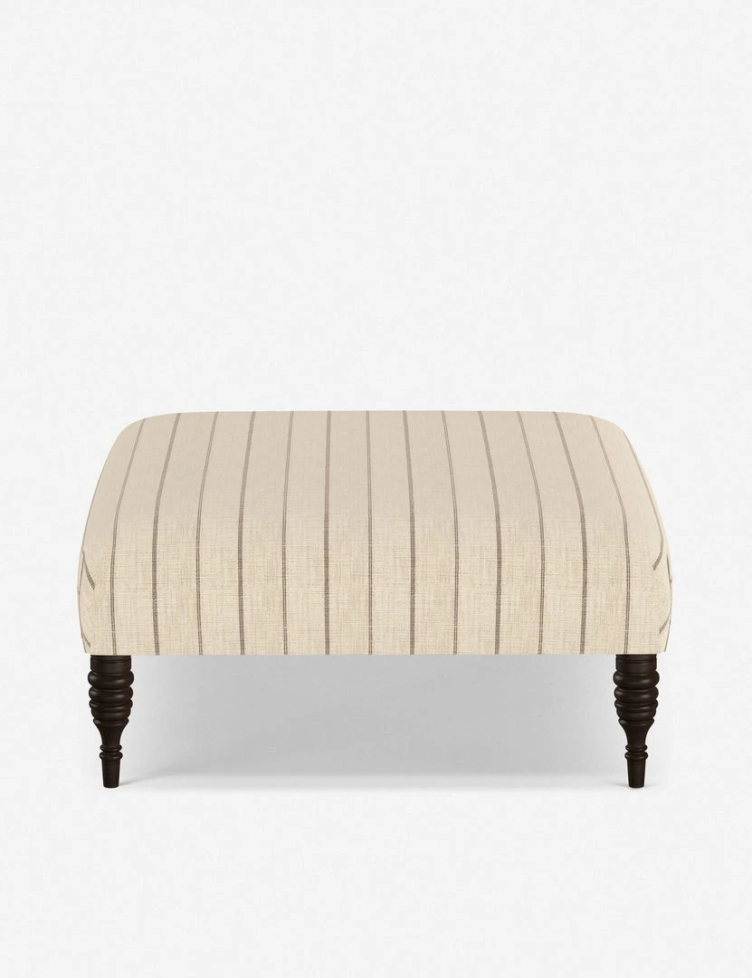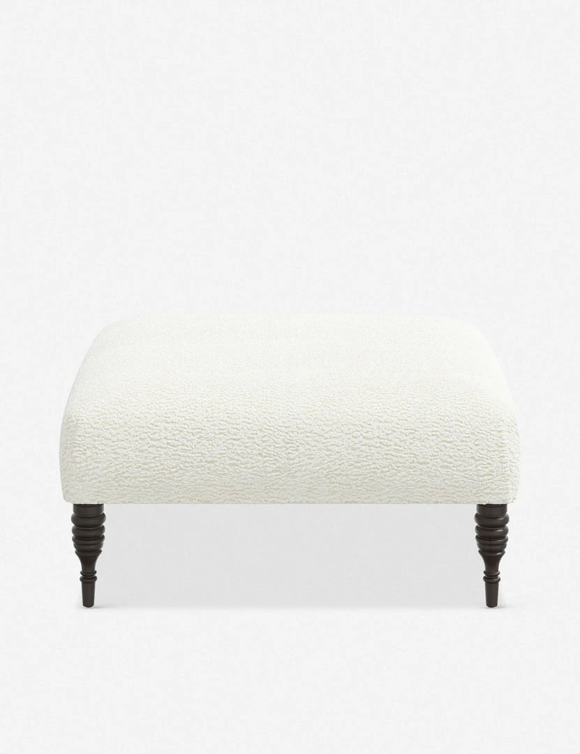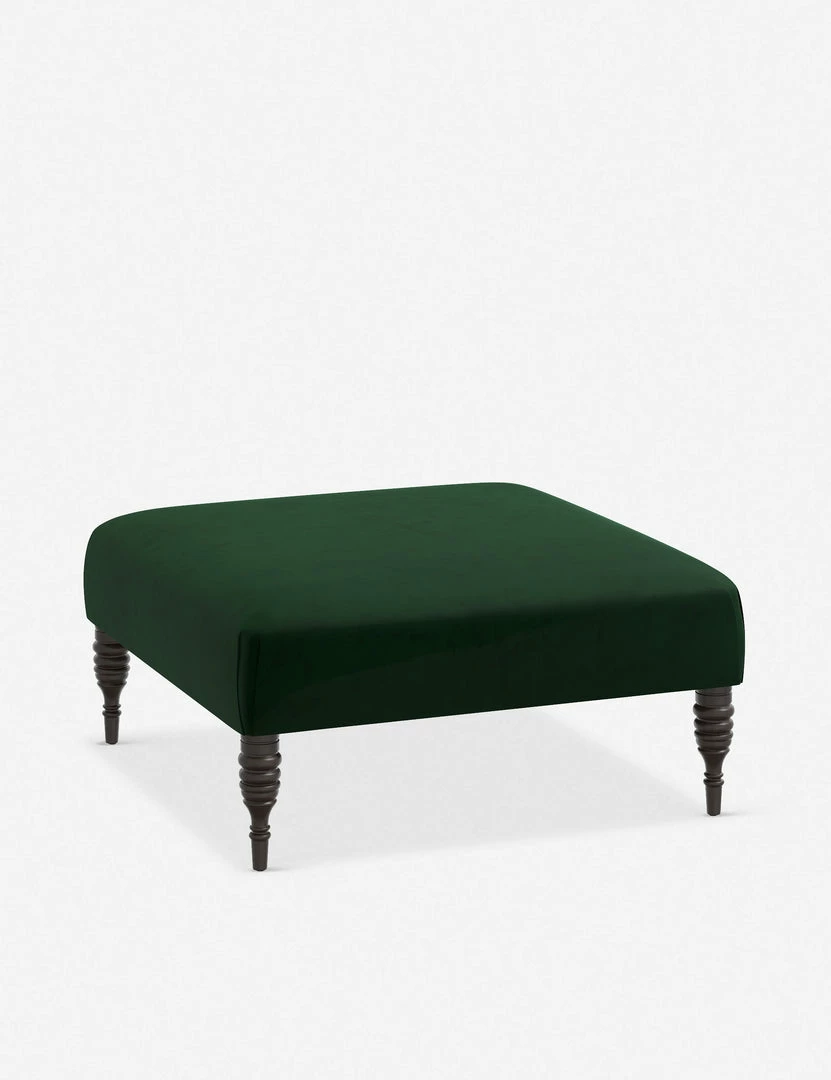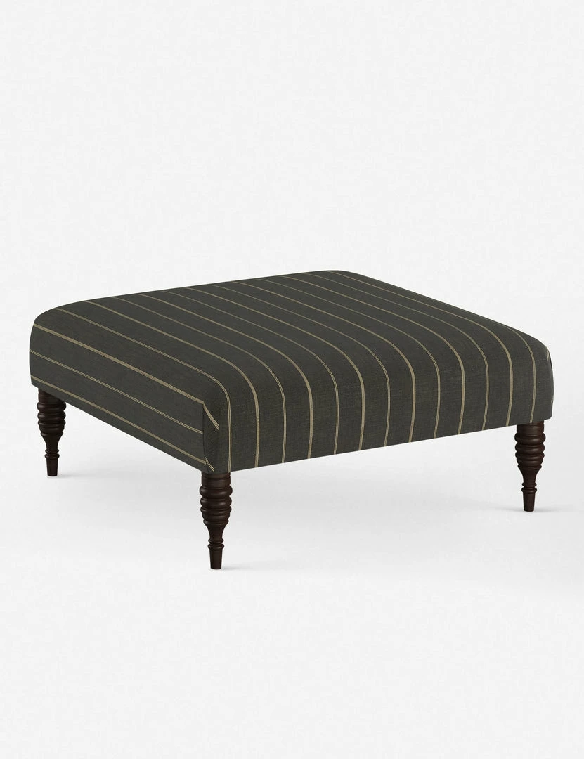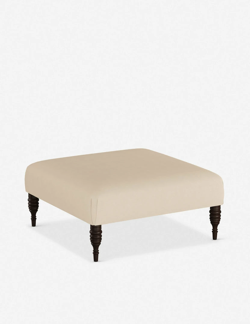With ornate turned legs and an upholstered top, this ottoman blends traditional details with a fresh design. Its proportions make it an ideal dynamic accent for a living room where it can be used for extra seating or as a coffee table