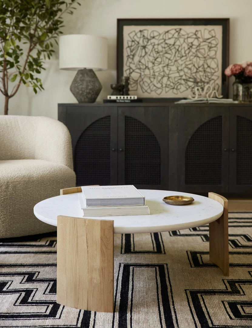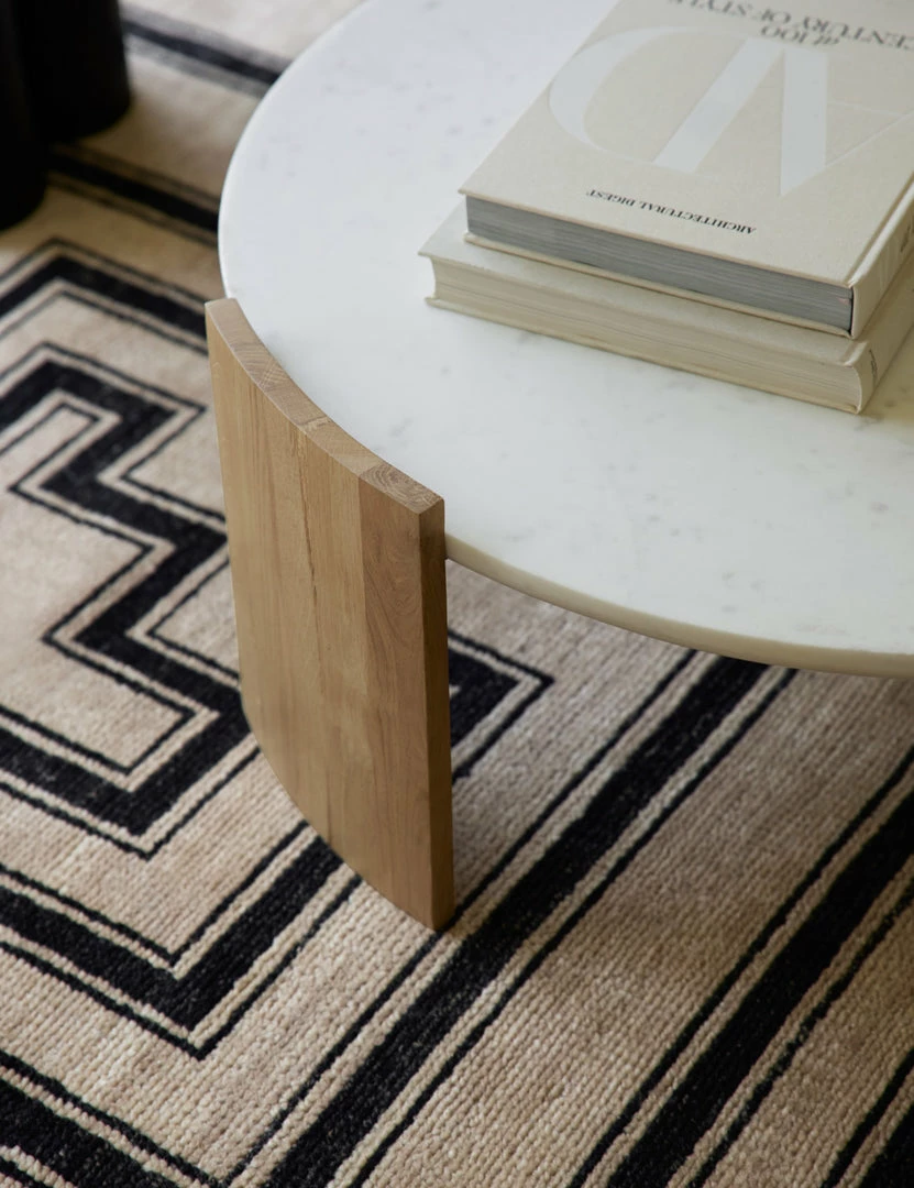 French deco notes play with raw organic tones in this modern coffee table design. We love how the oak legs softly frame the beautiful marble tabletop offering up a gently elevating silhouette. Style this marble coffee table with brass accents and a few favorite books for a splash of color and contrast.