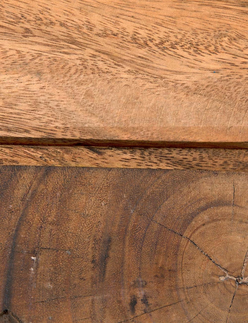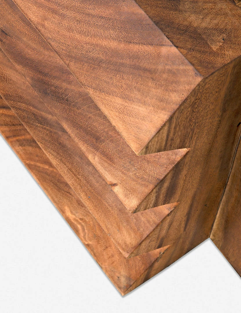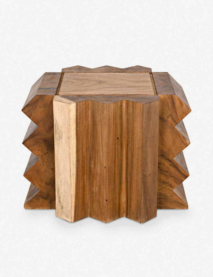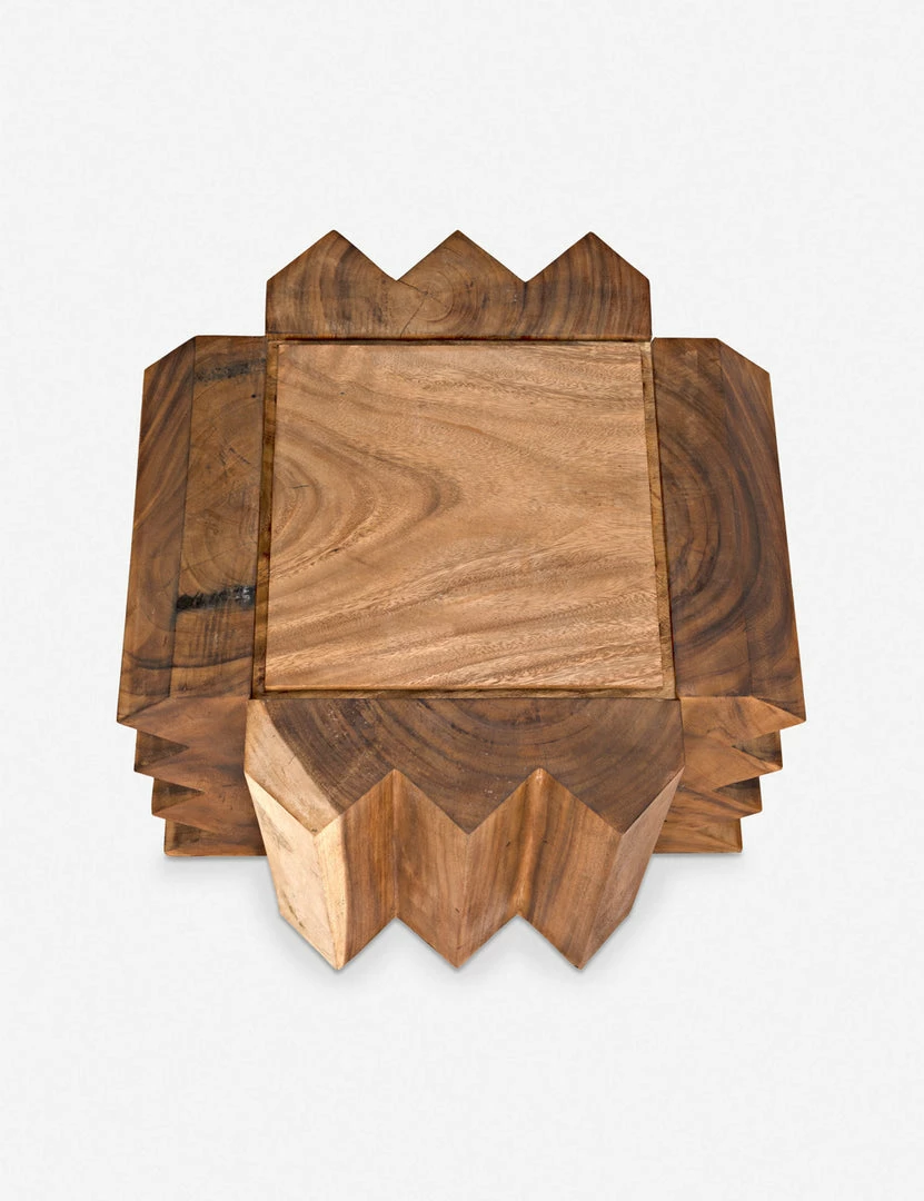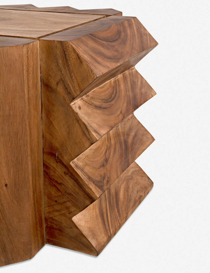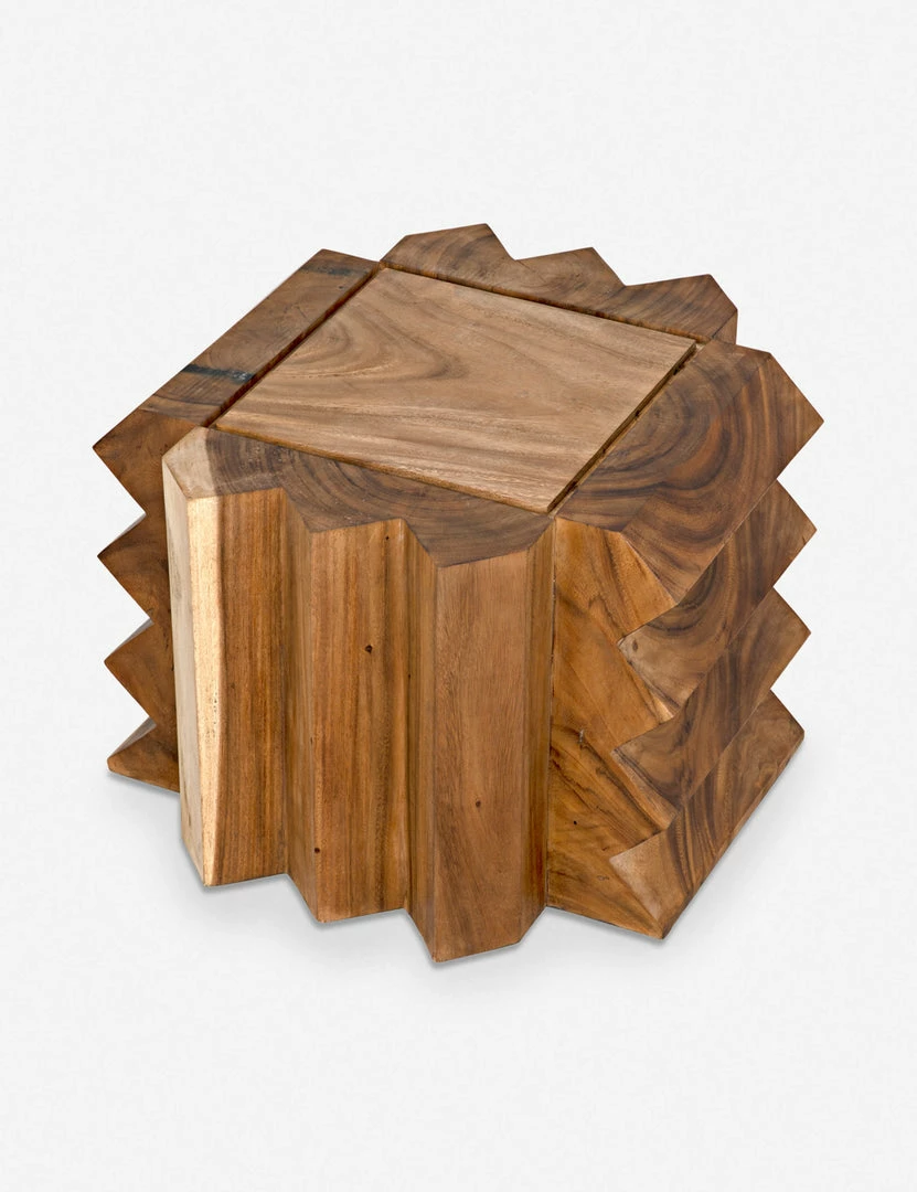 A jagged silhouette in warm teak brings a stylish edge with plenty of organic appeal to this unique end table. With its striking design and low profile, this signature wooden piece can be styled as a low side table or stool for a dynamic addition to your family room or lounge.
